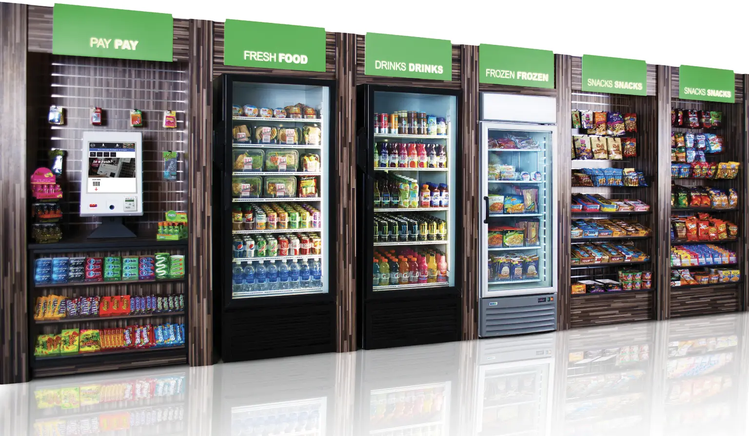 Employees select items and pay at a secure kiosk using credit or debit cards or mobile payments. It is quick, convenient, and fully cashless.